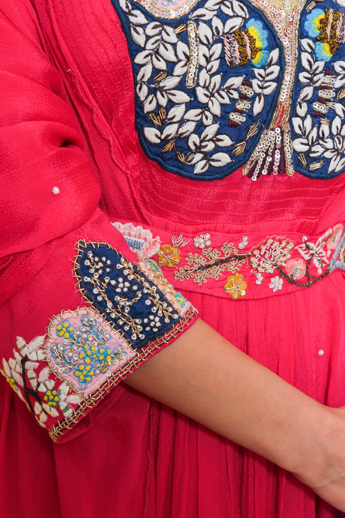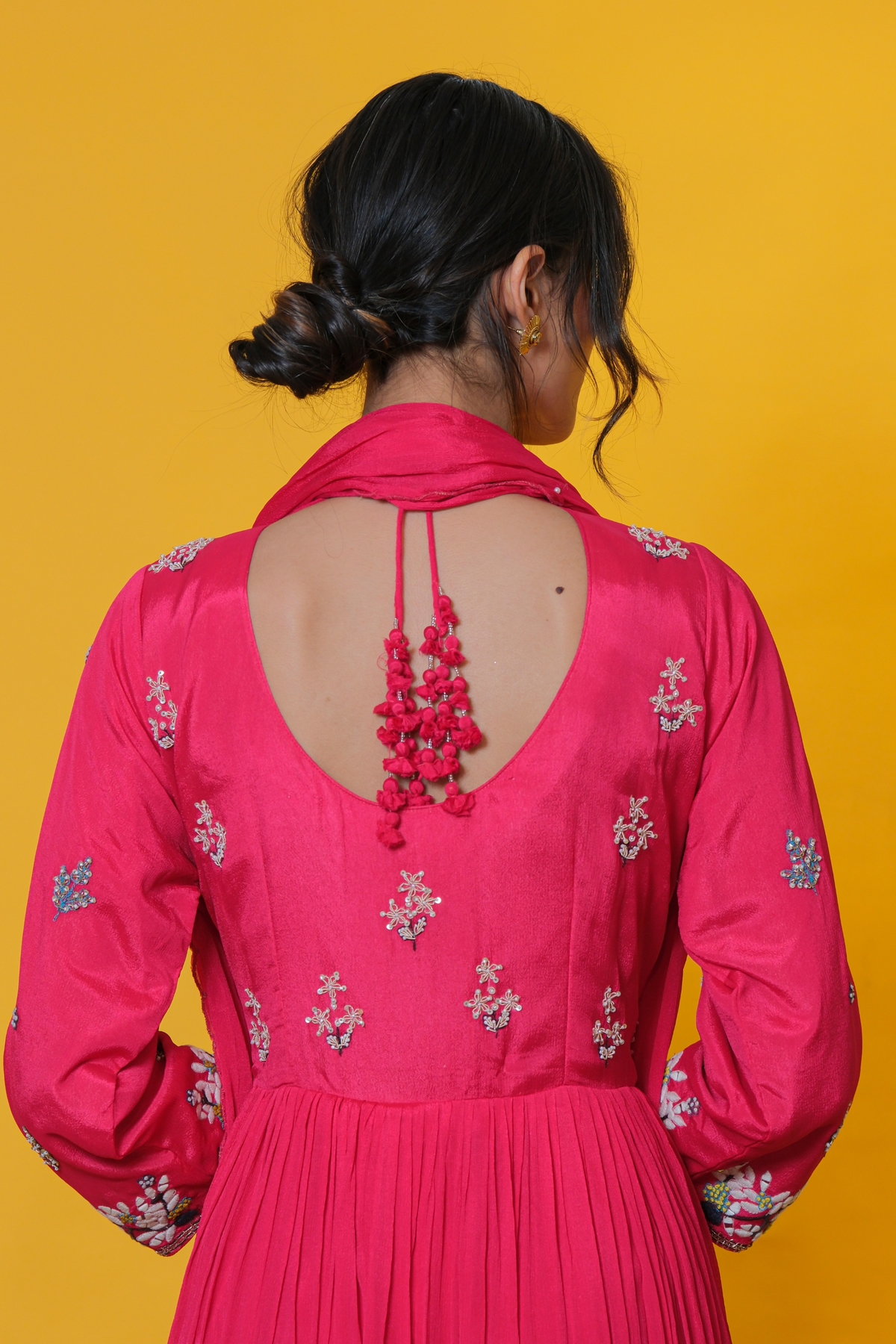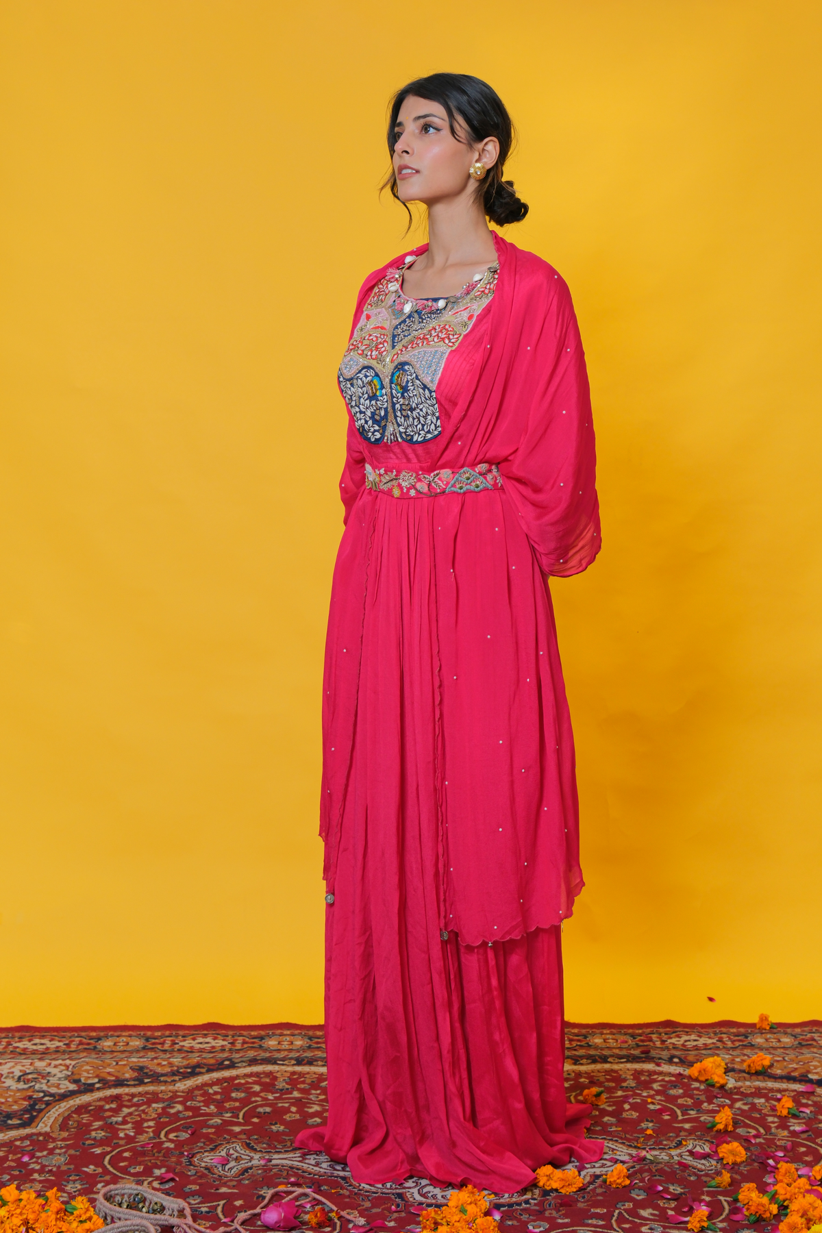 Command attention in hot pink! This kodi work dress with a matching dupatta and stylish belt with handwork of pearl ,aari, sequin, cutdana, resham which defines elegance with a touch of boldness