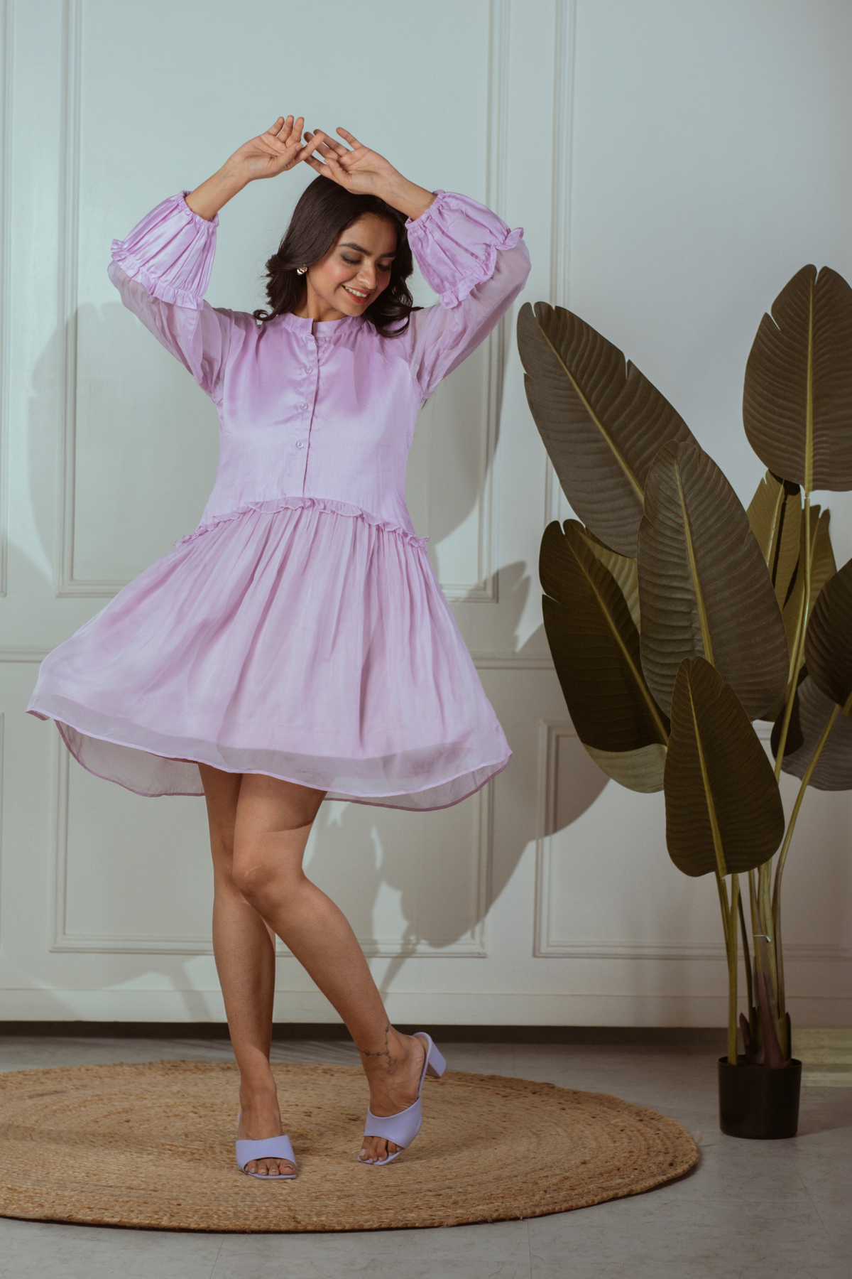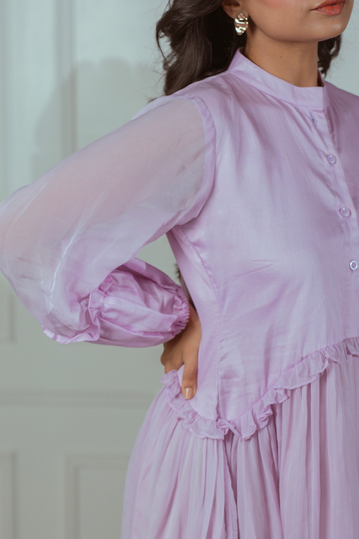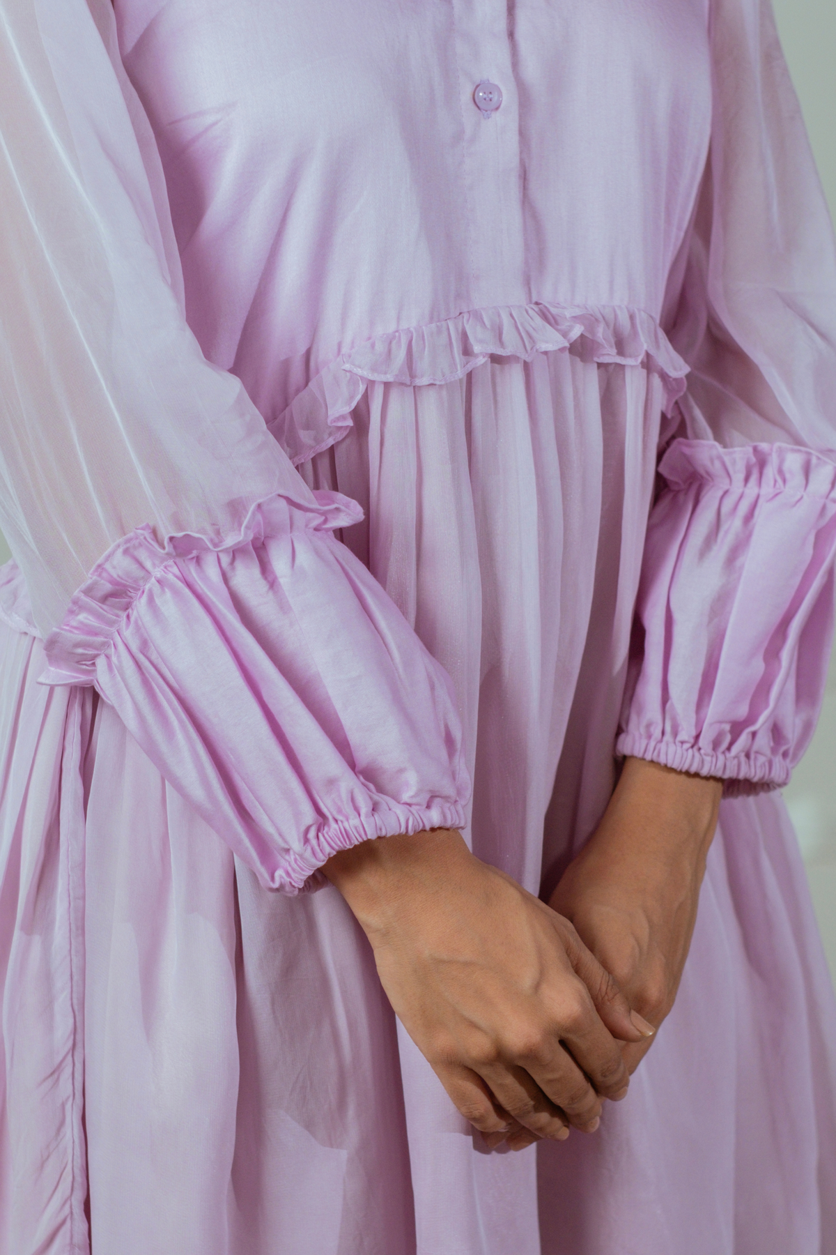 It's a oversized dress. This comes with voluminous blouseon sleeves with ruffle detailing. Fabric used in this dress is italian cotton and organza.