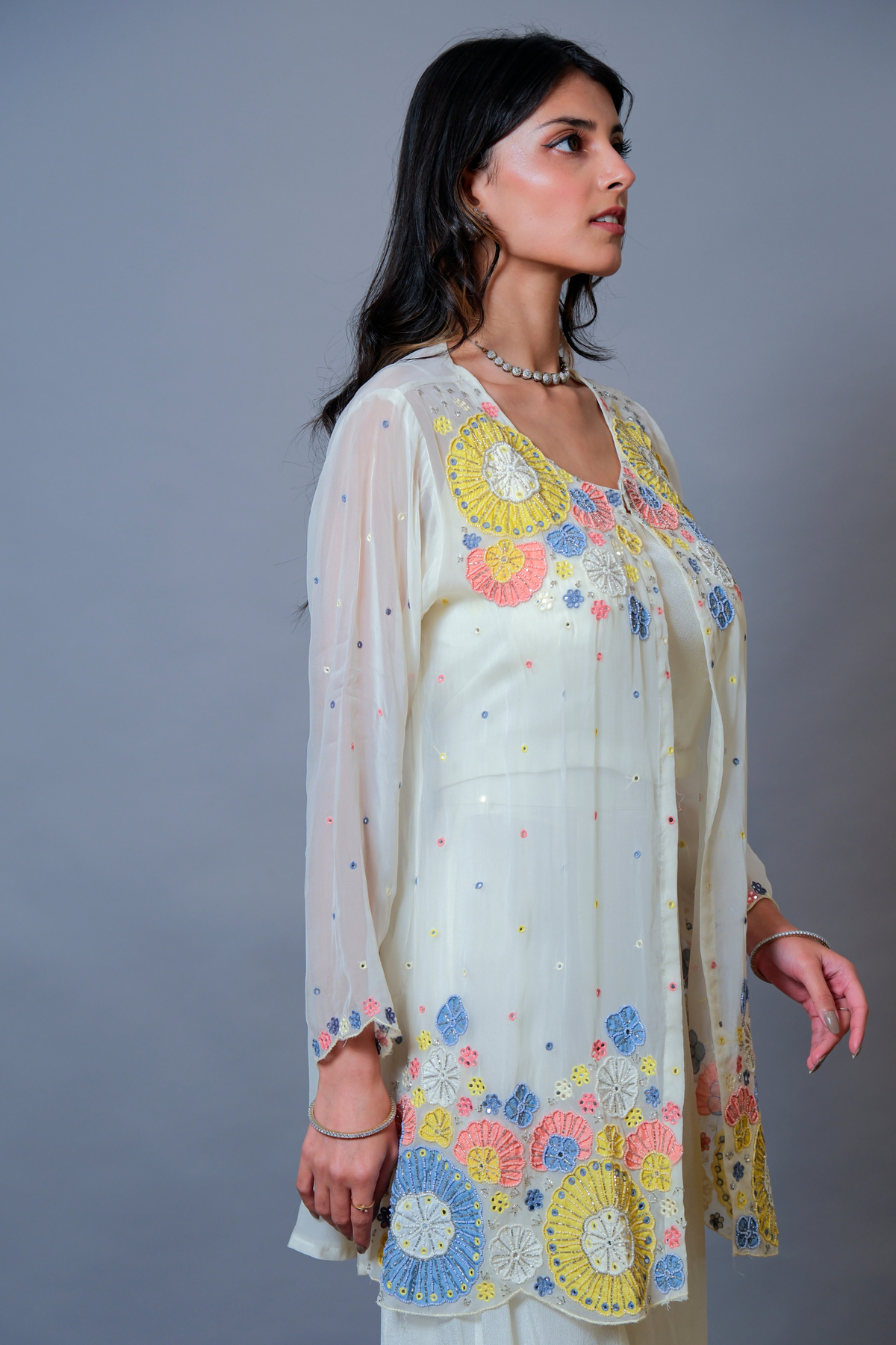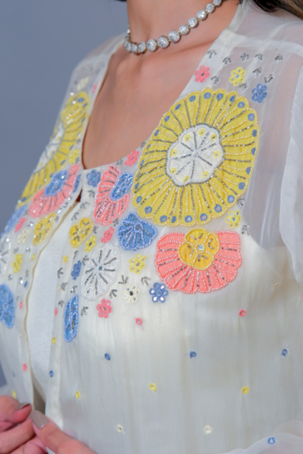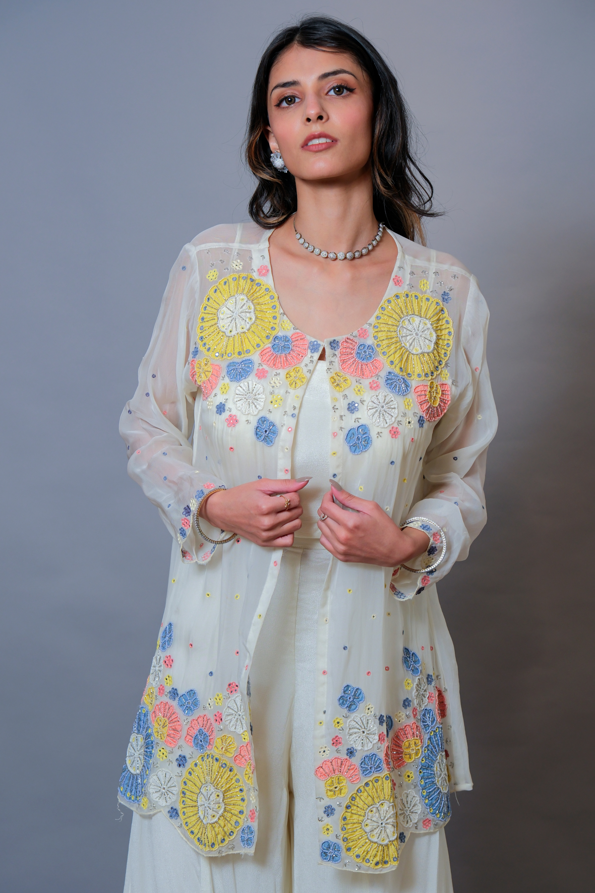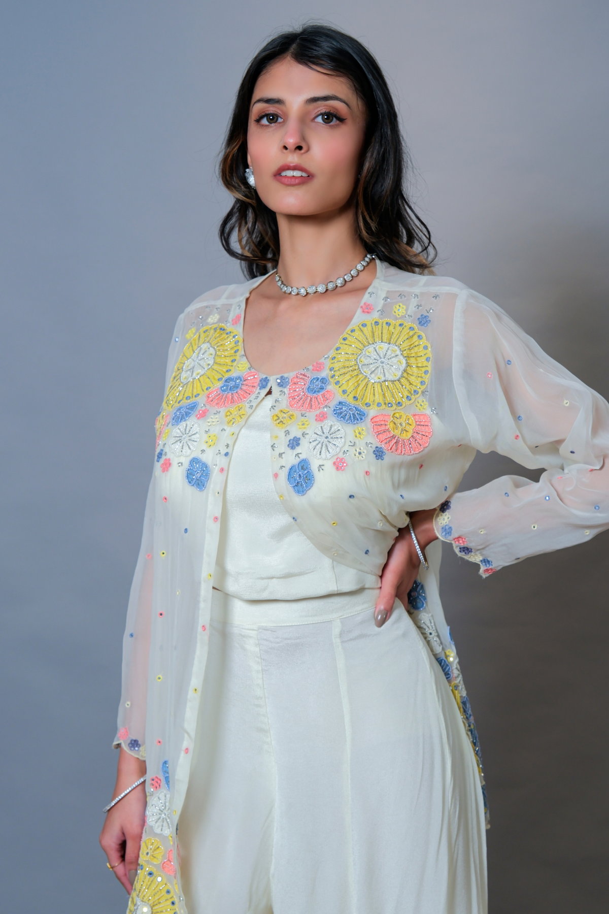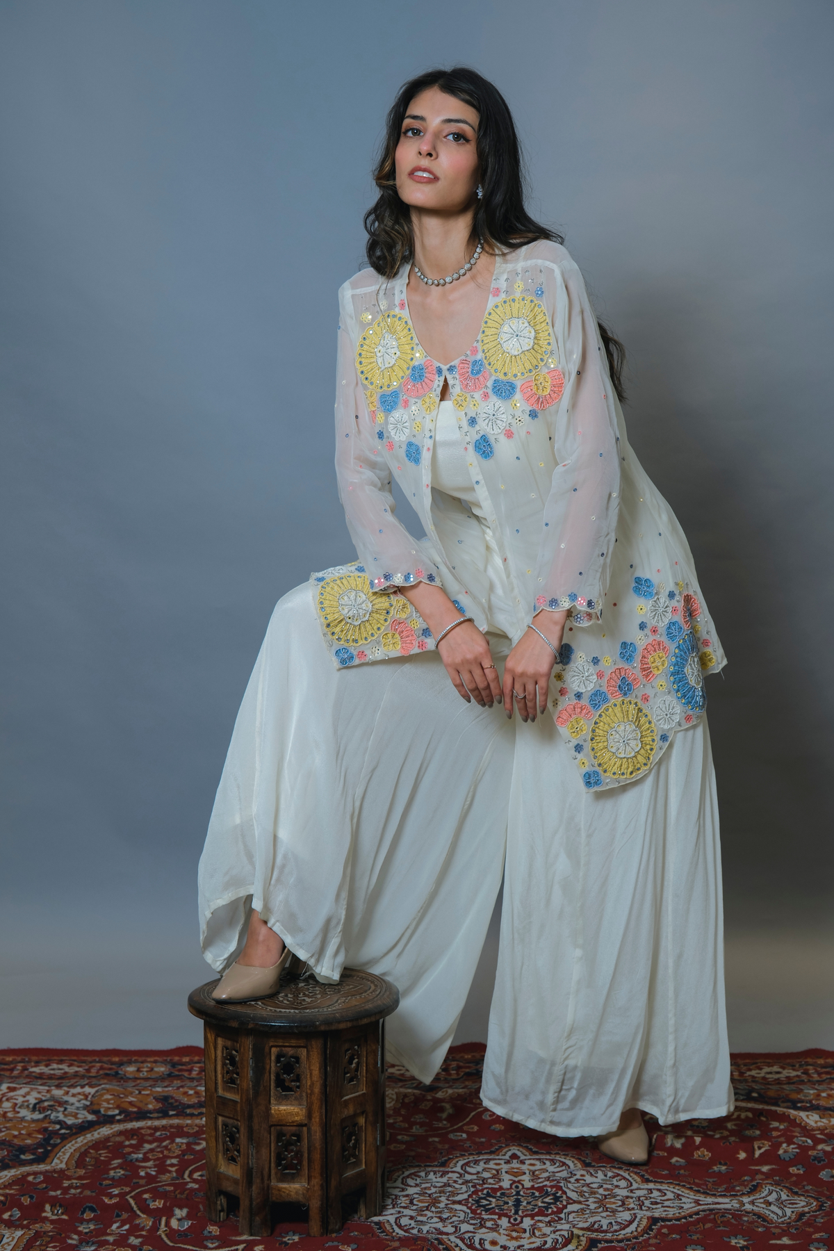 Dressed in pristine white co-ord set with jacket, adorned with a burst of colorful handwork of cutdana, pearl, resham and mirror. A co-ord set that speaks volume without saying a word.